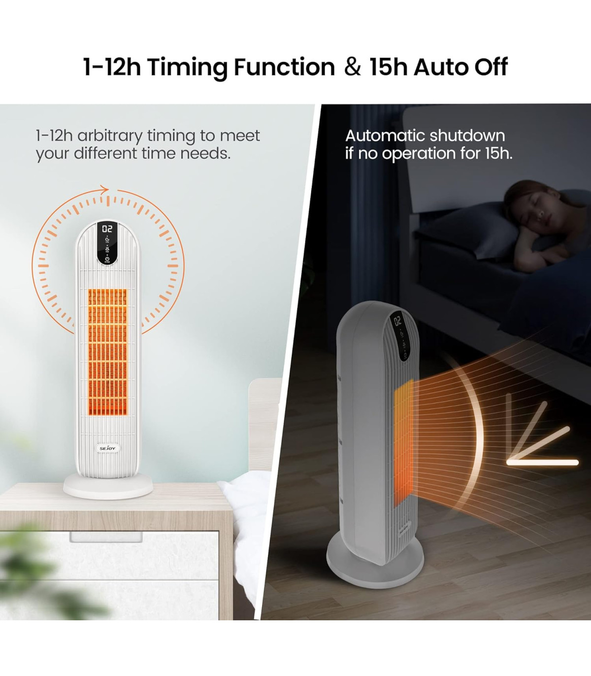 این بخاری برقی دارای دو نوع تایمر نیز می باشد.تایمر دستی 12 ساعته که به شما امکان تنظیم زمان خاموش شدن دستگاه را می دهد. و هم چنین تایمر خودکار 15 ساعته . این تایمر می تواند به صورت خودکار پس از هر 15 ساعت دستگاه را خاموش کند.