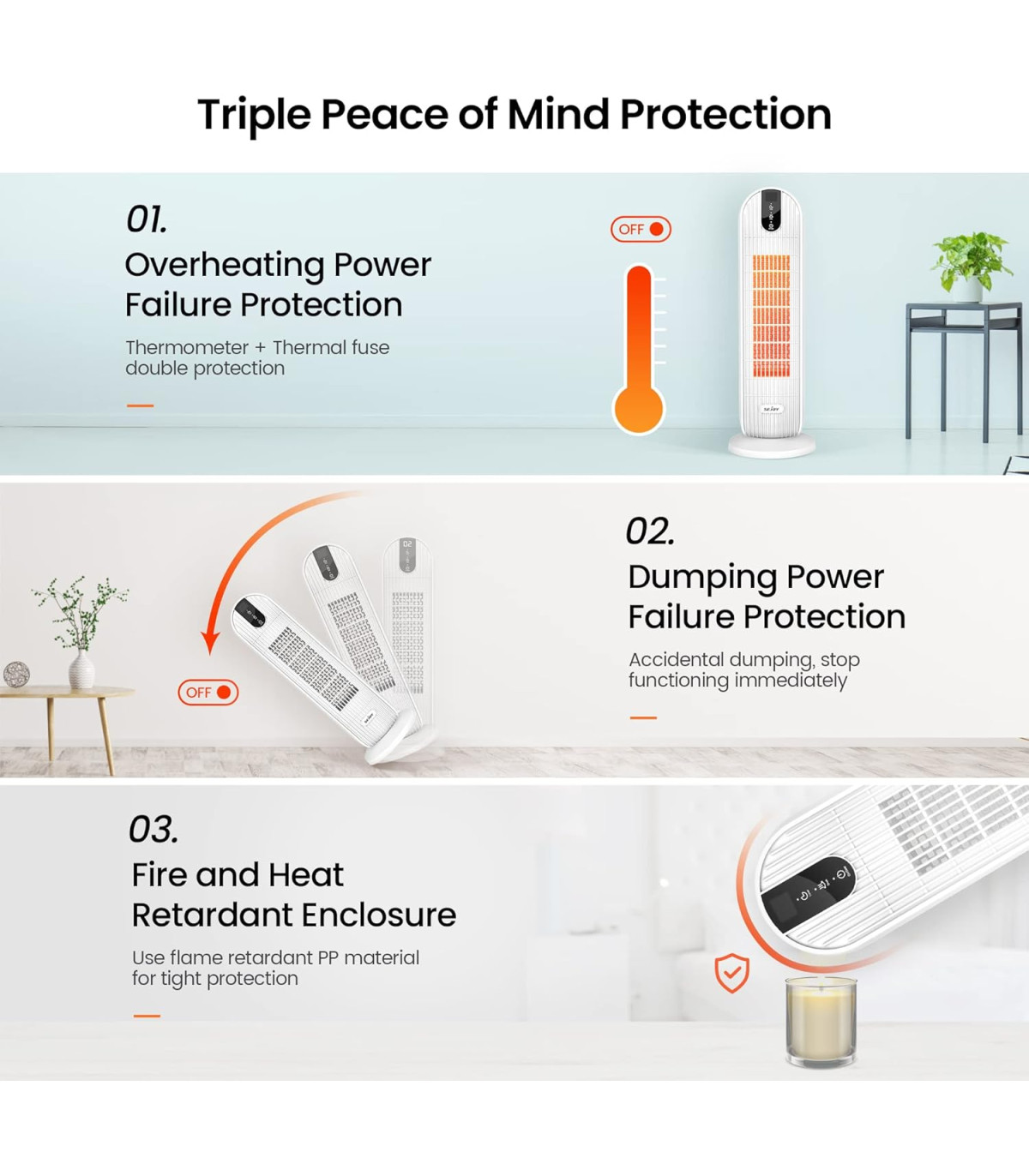 بخاری برقی Sejoy DNQ C20H5 دارای سه سطح ایمنی می باشد.1-وجود فیوز حرارتی که در برخی از هیتر برقی وجود دارد در اینجا نیز مورد استفاده است. در صورت افزایش حرارت به میزان بیشتر از سطح مجاز این دستگاه به صورت خودکار خاموش می شود.2-خاموش شونده گی خودکار در صورت وارد شدن ضربه و یا تکان ناگهانی به ان .این بخاری برقی به هر طریقی که از حالت عادی ایستایی خود خارج شود خاموش خواهد شد.3-سومین نکته ایمنی در این هیتر برقی استفاده از متریال و مواد با کیفیت و استاندارد است که نسبت به حرارت و داغ شدن مقاوم هستند و قابلیت اشتعال سریع ندارند.