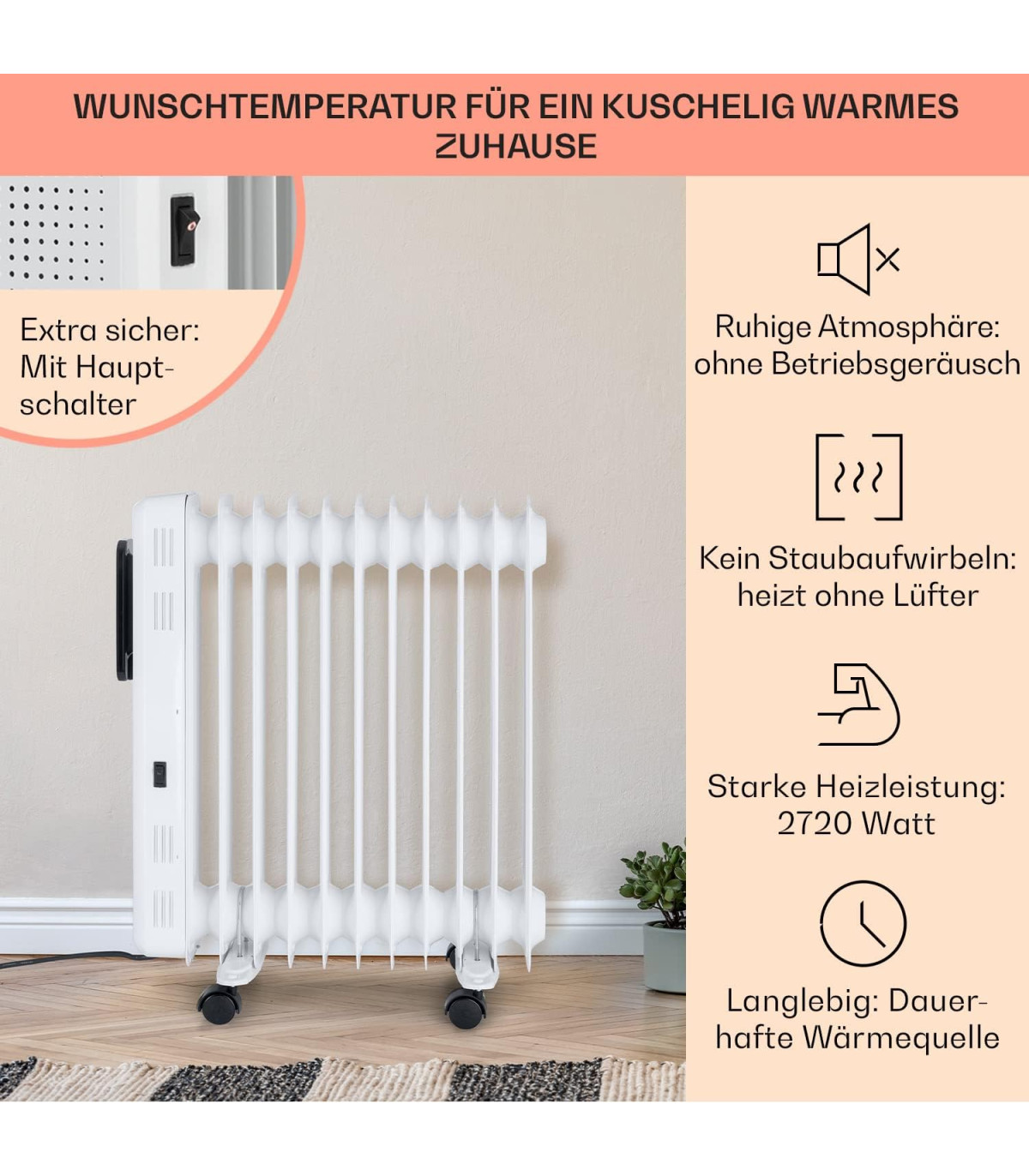 نگران سرما زمستان نباشید بخاری برقی ما به سرعت فضایی گرم در خانه شما ایجاد میکند. این رادیاتور روغنی با قدرت ۲۷۲۰ وات و مصرف انرژی پایین، توزیع یکنواخت هوای گرم را در هر اتاقی تضمین میکند.فضای تا 54 متر مربع را می تواند پوشش بدهد بنابراین در منزل ، محل کار یا هر مکان دیگری می توانید از ان استفاده کنید.